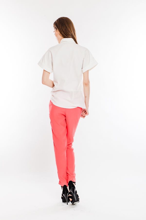 Блуза прямого силуэта, закрывает бедра, но в то же время достаточно легка, чтобы носить ее заправленной в брюки или юбку. Короткие рукава приспущены, что придает линии плеч покатость и женственность. Рубашечный воротник продолжается закрытой планкой, которая не доходит до низа изделия, придавая ему немного неформальный вид.
