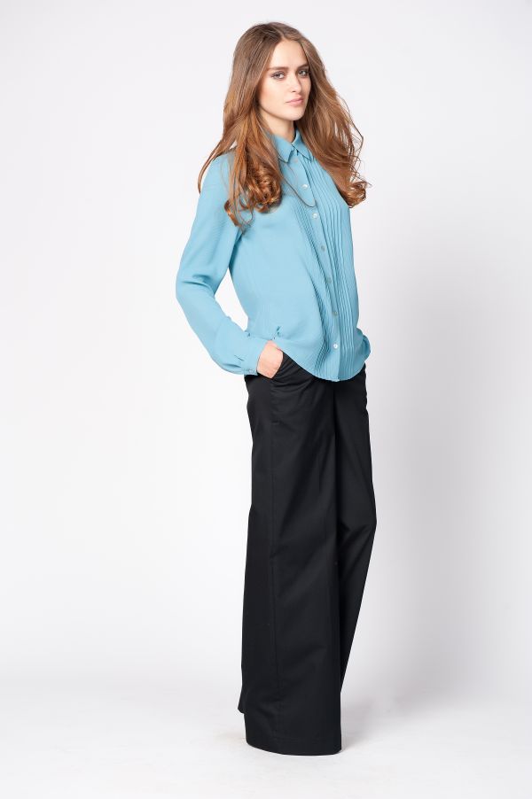 Рубашка выполнена в классическом стиле, с острым воротником и длинными рукавами. Низ блузы волнами, что позволяет носить ее как навыпуск, так и заправленной. Очаровательная деталь - мелкая вертикальная плиссировка-строчка украшает полочки, удлиняя и стройня силуэт и придавая вам романтичный и немного кокетливый вид.