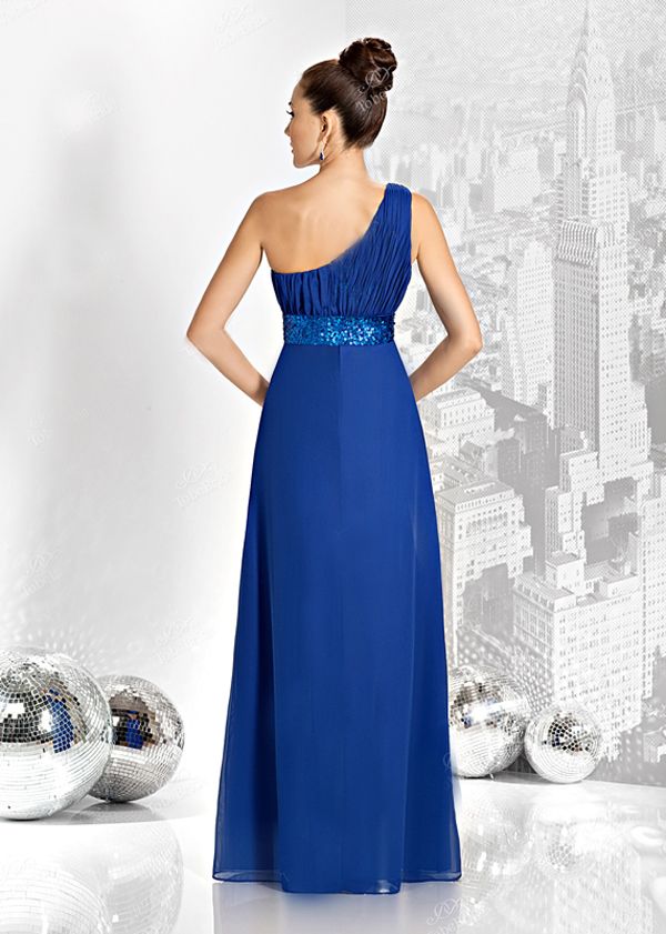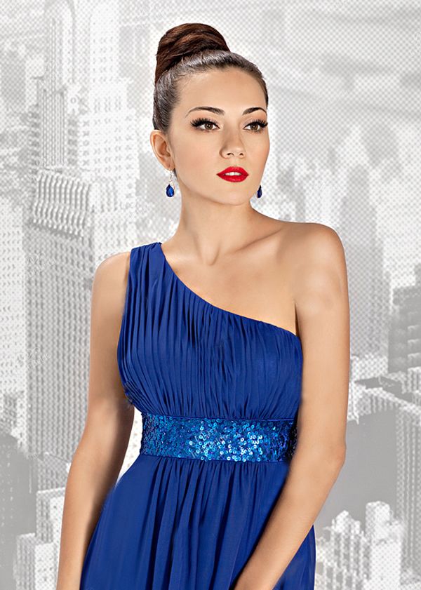 Утонченное вечернее платье изысканного лазурно-синего цвета выполнено в эффектном стиле «ампир» с завышенной талией, которая подчеркнута яркой деталью – изящно декорированным поясом. Драпировка на лифе придает особенное обаяние силуэту, который также подчеркнут длинной струящейся юбкой. Шифон, из которого выполнено платье, мягко облегает фигуру, придавая грациозность и женственность всему образу.