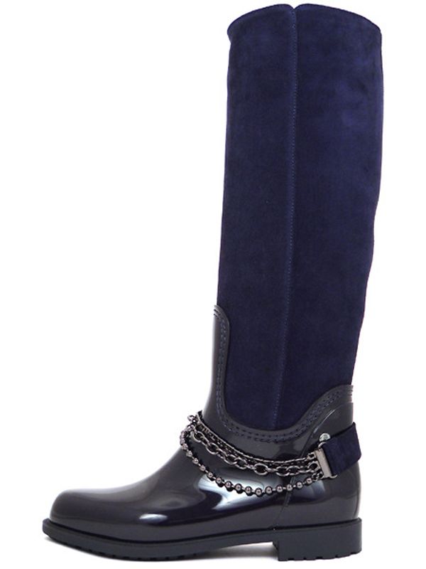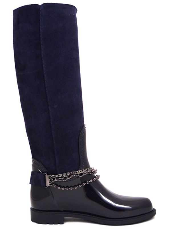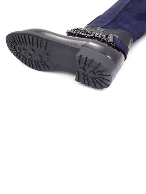 Изящная модель темно-синего цвета выполнена в классическом фасоне «английский сапог», особый шарм которому придает декоративный аксессуар из цепочек (съемный).