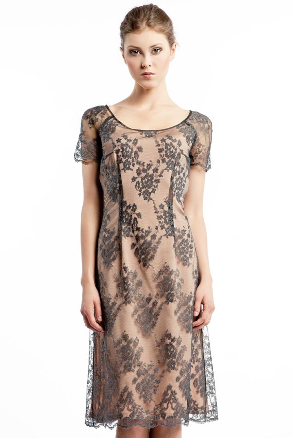 Эксклюзивная модель из коллекции модного Дома «Iya Yots» – элегантное коктейльное платье, необычайное изящество которому придает эффектное и изысканное кружево, из которого оно выполнено. Кружево мягкого графитового цвета деликатно струится поверх нежно-бежевой шелковой подкладки, создавая необыкновенную колоритную гармонию сочетания цветов, что придает особую утонченность образу.