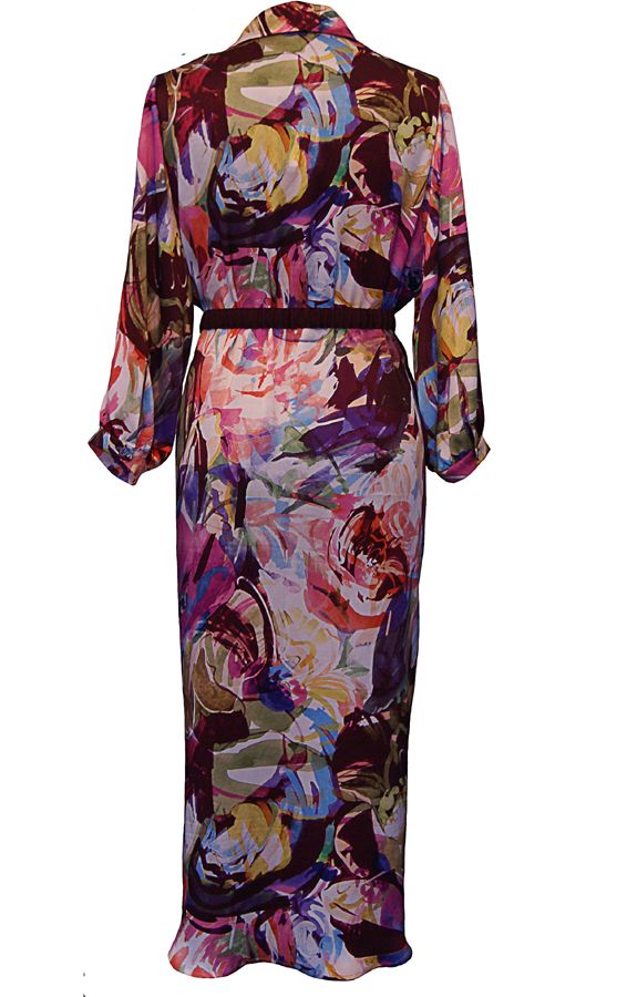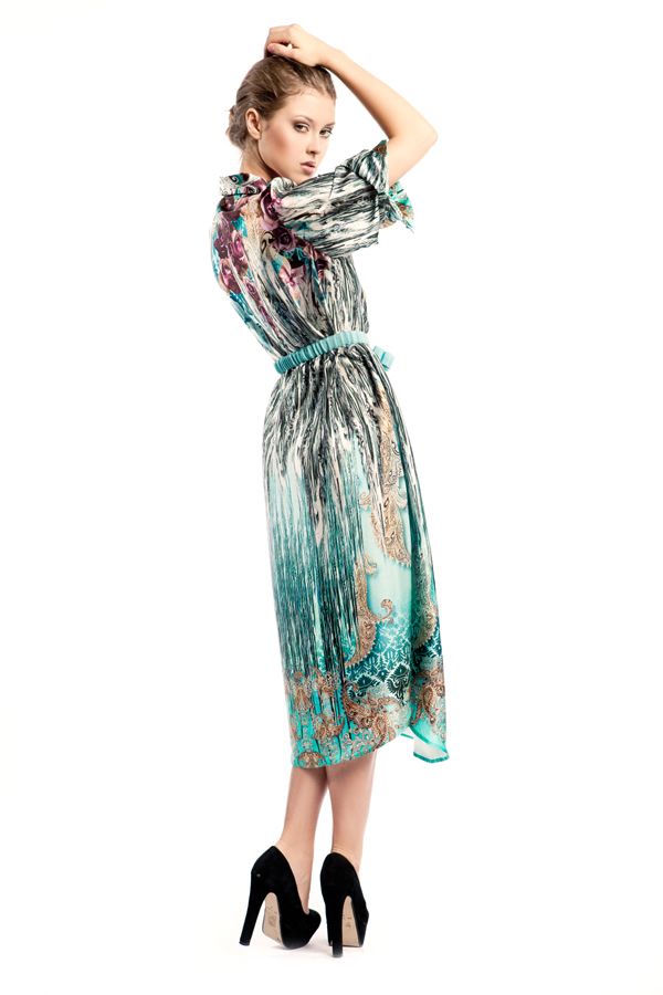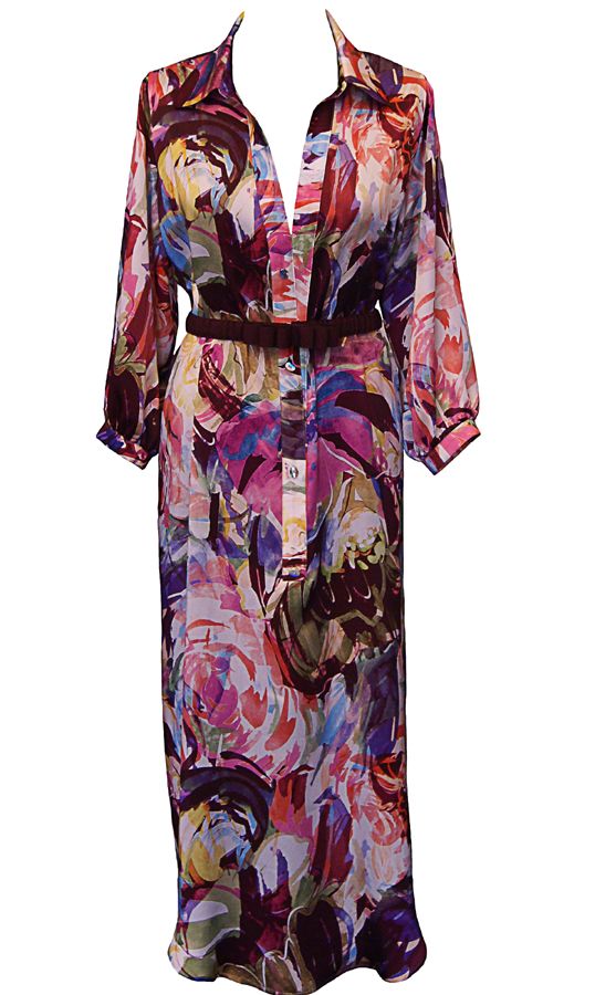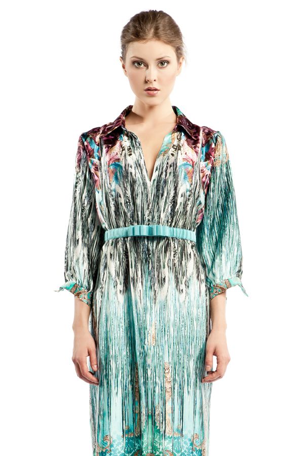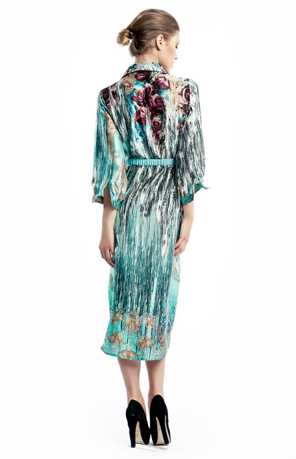 Эксклюзивная модель из коллекции модного Дома «Iya Yots» – эффектное платье-рубашка прямого силуэта с завышенной линией талии, которая изящно подчеркнута деликатным лентой-пояском. Необыкновенно насыщенный рисунок ткани придает модели неординарность и самобытность, а шелк, из которого она выполнена, мягко струясь, подчеркивает грацию фигуры. Особый шарм платью придают изысканные декоративные пуговицы Swarovski, выполненные в единой цветовой гамме.