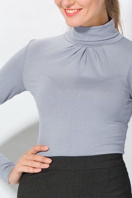 Нежно-серая облегающая блузка с длинными рукавами, воротником «стойка» и присборкой на груди, создающей легкую драпировку. Модель, которая выполнена в стиле банлон, или, как еще называют этот удивительно элегантный фасон – водолазка, несомненно, станет практически незаменимой в осенне-зимнем гардеробе модного осенне-зимнего сезона. Блузка не только изящна, но также весьма комфортна, благодаря эластичности и мягкости вискозы, из которой она выполнена, но, главное – блуза удачно сочетается со многими видами одежды в гардеробе современной леди. Модель удивительно гармонирует с различными стилистическими направлениями и станет отменным дополнением к деловому и офисному костюму, к одежде спортивного стиля, а также окажется весьма комфортной для простой прогулки по магазинам.