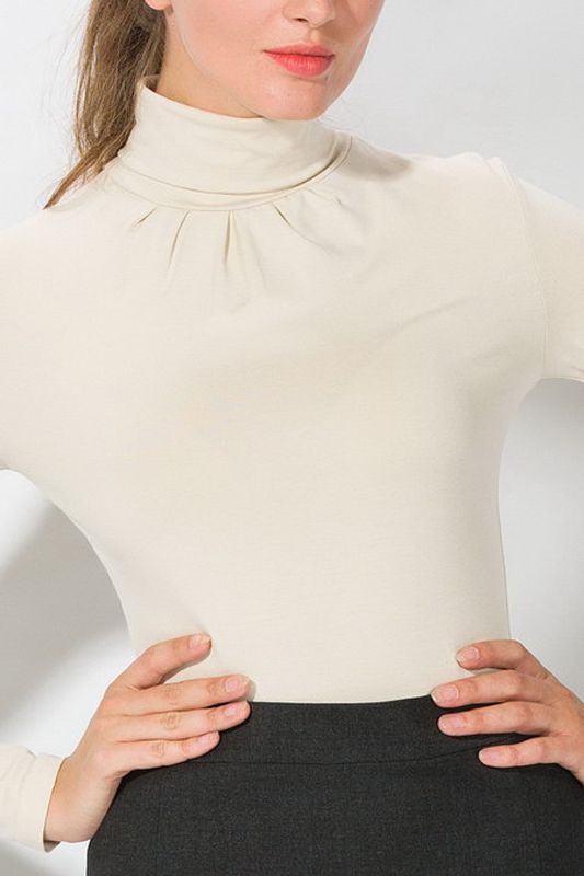Нежная бежевая блузка облегающего силуэта с длинными рукавами, воротником «стойка» и присборкой на груди, создающей легкую драпировку. Модель, которая выполнена в стиле банлон, или, как еще называют этот удивительно элегантный фасон – водолазка, несомненно, станет незаменимой в гардеробе модного осенне-зимнего сезона. Блузка не только изящна, но также весьма комфортна, благодаря эластичности и мягкости вискозы, из которой она выполнена, но, главное – блуза удачно сочетается со многими видами одежды в гардеробе современной леди. Модель удивительно гармонирует с различными стилистическими направлениями и станет отменным дополнением к деловому и офисному костюму, к одежде спортивного стиля, а также окажется весьма комфортной для простой прогулки по магазинам.