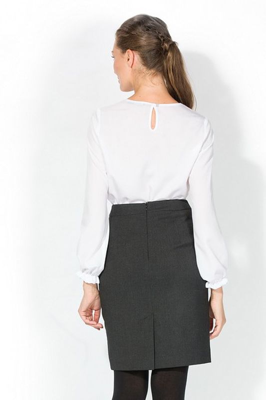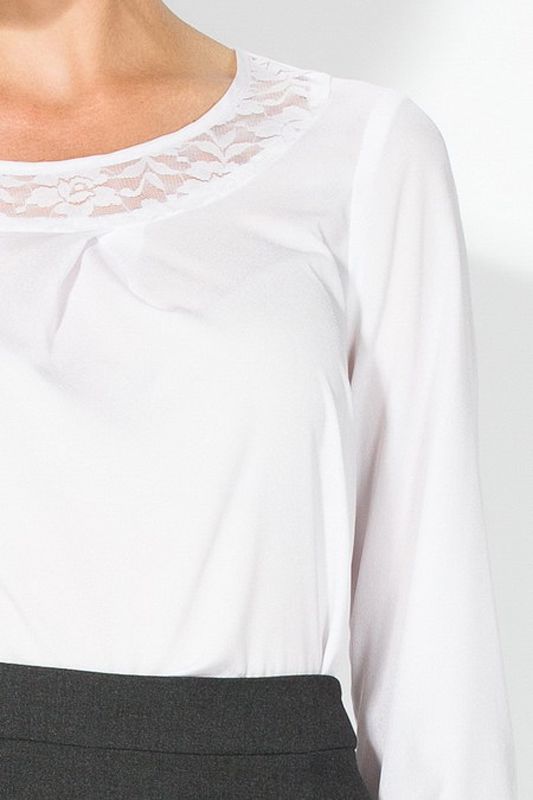 Изящная белоснежная блуза с элегантным с вырезом-лодочка, декорированным изысканным кружевом и деликатными манжетами-рюшами. Модель удачно подчеркнет стиль респектабельного делового костюма, придаст особое изящество костюму для торжественного выхода, будет удачным выбором для студенческого гардероба, а также окажется всегда «кстати» для прогулки по магазинам. Блузка гармонирует со многими видами одежды в гардеробе современной леди и сочетается с юбками и брюками множества фасонов.