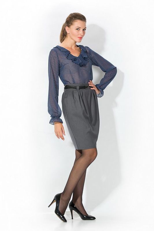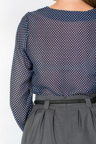 Романтичная, но в то же время деловитая и респектабельная, эта модель станет ярким дополнением гардероба современной леди. Отделка выреза и манжет деликатными рюшами, придают блузке особый шарм, а принт в мелкий «горох» добавляет особого изящества. Блузка не только элегантна, но также весьма комфортна, благодаря эластичности и мягкости ткани, из которой она выполнена