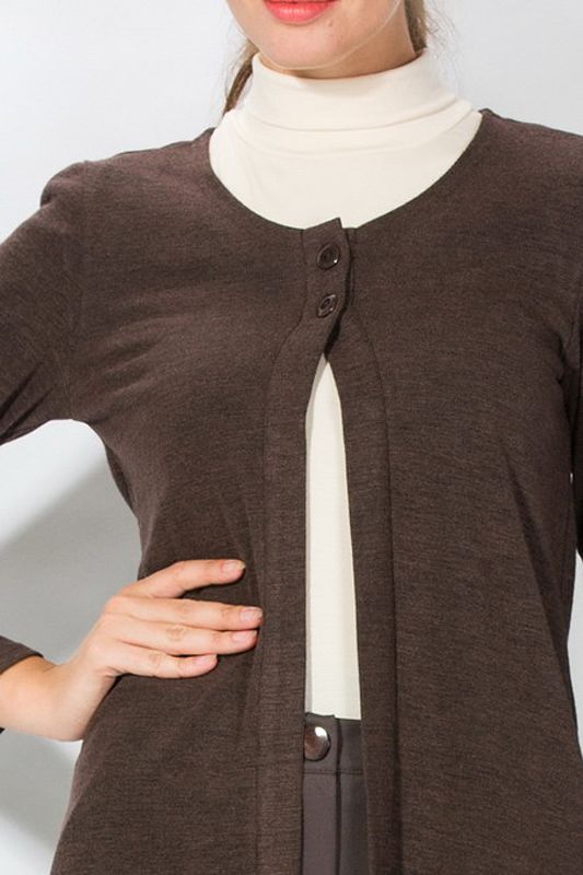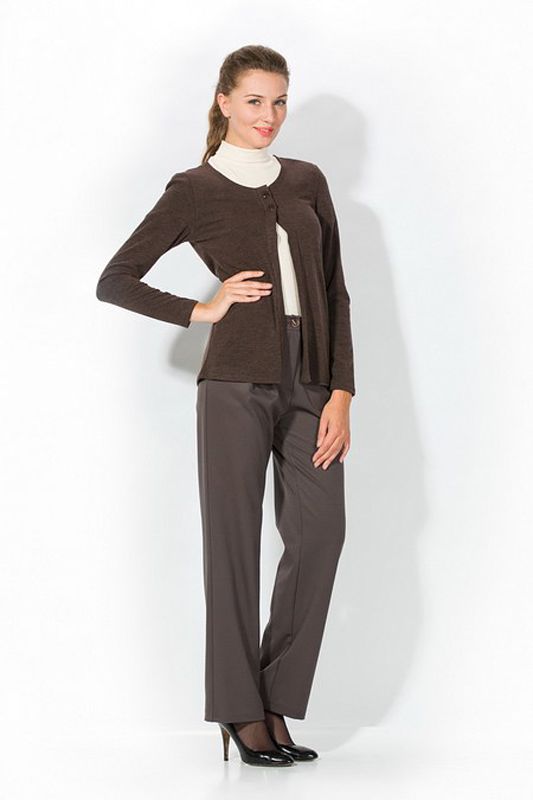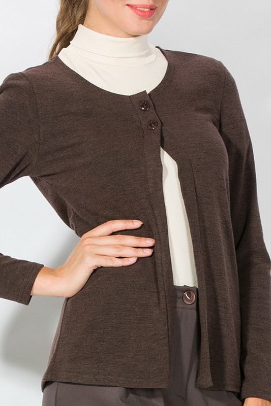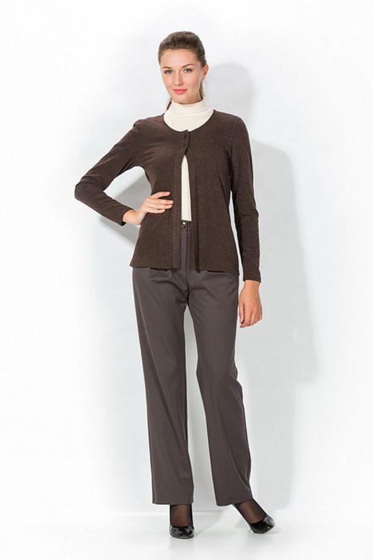 Стильный жакет прямого кроя без воротника, что делает модель схожей с укороченным кардиганом, имеет оригинальную застежку на две пуговицы. Эта элегантная модель может гармонично сочетаться со многими видами одежды – юбкой, брюками, платьем классических фасонов. Жакет выразит офисный стиль, станет прекрасным дополнением в гардеробе студентки, а также будет всегда «кстати» для простой прогулки по магазинам.