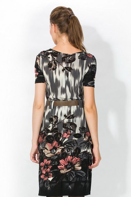 Изящное приталенное платье с прямой юбкой – классика изысканного стиля. Шарм модели придает оригинальный цветочный принт, выполненный в черно-белой гамме, которая подчеркивает эффект малиновых букетов. Мягкая, струящаяся ткань, из которой выполнено платье, подчеркивает грацию фигуры и утонченность силуэта. Изюминку и штрих неординарности платью придает аккуратный ремешок на линии талии.