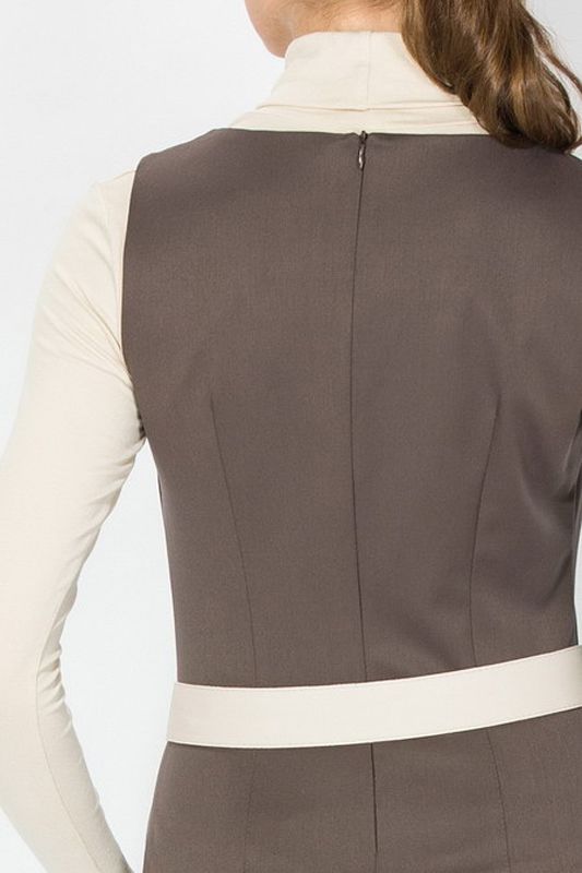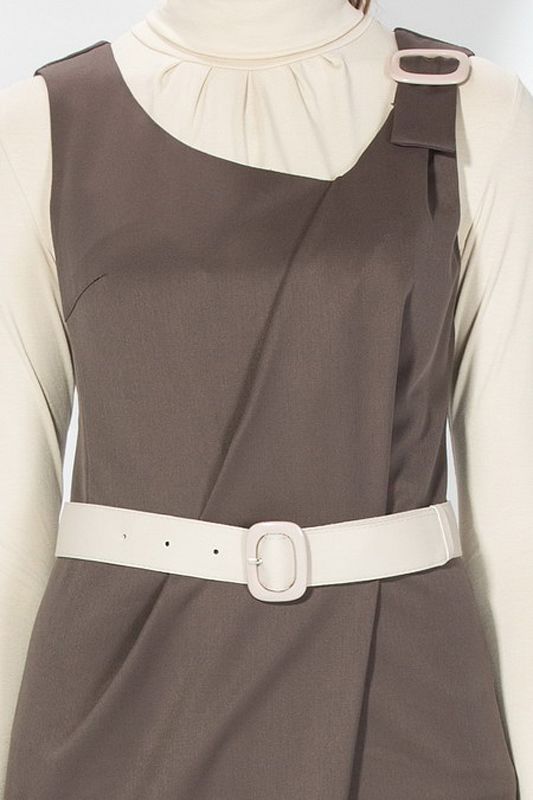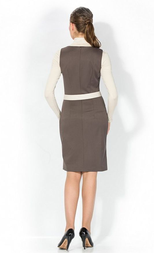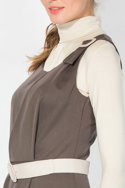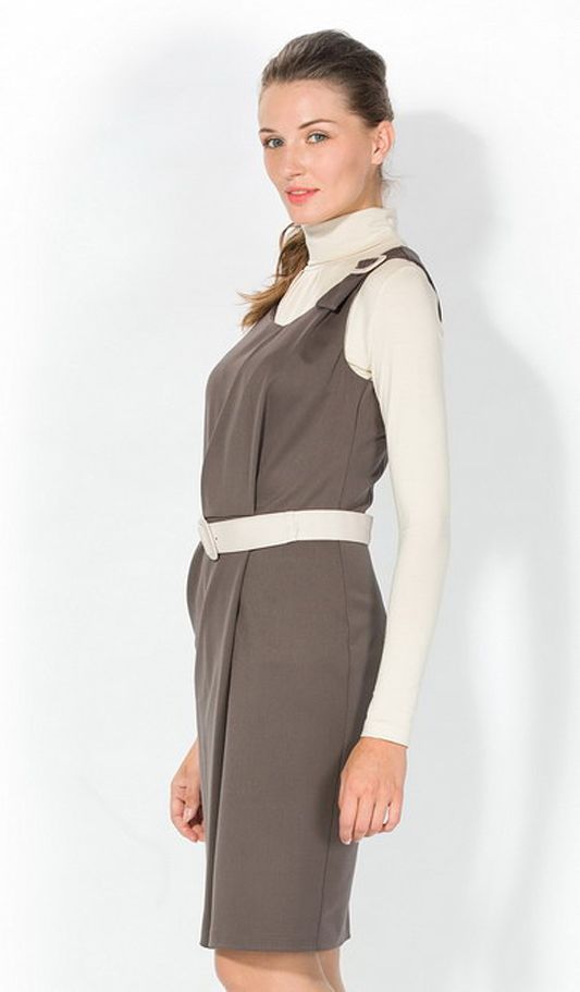 Эффектная модель платья на бретелях, которое позволит бесконечно фантазировать над различными стилистическими вариантами Вашего образа. Платье удивительно гармонично сочетается со многими фасонами блузок, а ее утонченный «шоколадный» пастельный тон составит любой, даже самый неординарный ансамбль цветовых сочетаний с другими предметами Вашего гардероба, подчеркнув особенность и индивидуальность Вашего стиля. Ярким аксессуаром модели является контрастный ее цвету белоснежный ремешок, который подчеркивает линию талии.