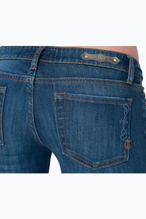«Соло» - изящные обтягивающие узкие джинсы темно-синего цвета с элегантным узором-вышивкой на заднем кармане от Taya Jeans.