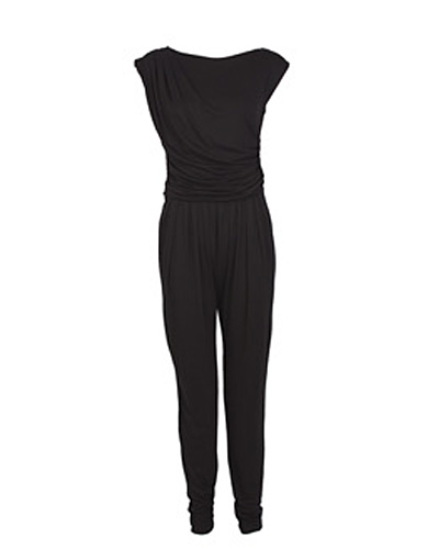 Изящный и женственный комбинезон из топа и брюк с эффектным решением в крое. Оригинальное использование драпировки на брюках, которая образует мягкие струящиеся волны, подчеркивает грацию линии бедер, драпировка верха подчеркивает стройность талии, а вырез «лодочка» спереди, который изящно переходит в глубокий, также эффектно драпированный, вырез на спине, придает всему образу модели не только особую эксклюзивность, но и необычный колорит и шарм.