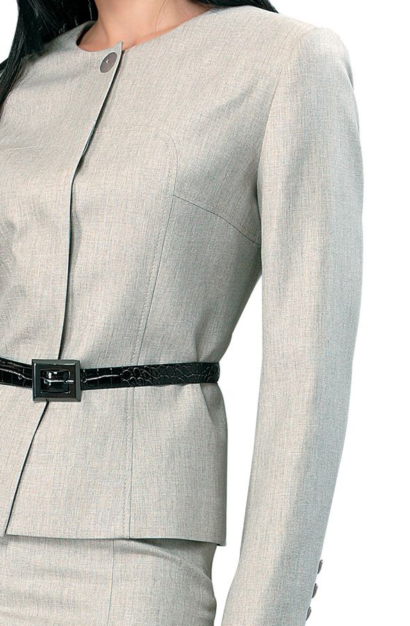 Изящный светло-серый жакет с цельнокроеными рукавами-реглан, подчеркивающими линию плеч и изящным округлым вырезом без воротника. Приталенный жакет подчеркивает утонченность делового стиля, а рельефные вытачки по линии груди придают силуэту необыкновенную грацию. Потайная застежка придает особый декоративный эффект пояску, выполненному в контрастном черном цвете. Модель, несомненно, станет одной из ярких в гардеробе современной леди, подчеркнет элегантность стиля своей обладательницы.