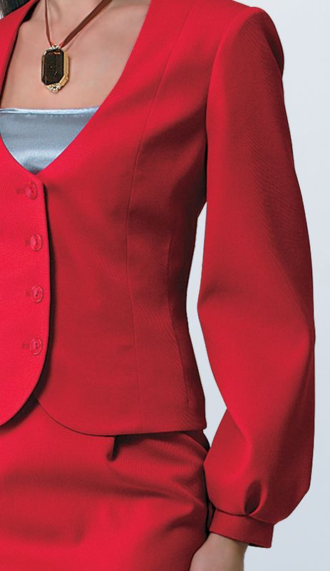 Яркий жакет с низким вырезом и присборенными у манжета рукавами, напоминает фасоном стильного блузона, что придает модели особый шарм и колорит. Низкий вырез позволяет подобрать к жакету множество вариантов блузок и топов, а его приталенный укороченный крой позволит бесконечно фантазировать над ансамблем с юбками и брюками при создании костюма. Эффектный красный цвет, как и неординарный смелый крой модели, подчеркнет Ваш особенный яркий вкус.