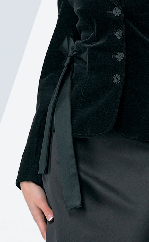 Приталенный жакет классического кроя с традиционными «английским» воротником с отворотами и застежкой на пуговицы, но с невероятно темпераментным и эффектным кроем. Оригинальный пояс , завязывающийся сбоку на талии, либо сзади на изящный бант, придаст этому деловому жакету особый экспрессивный и даже кокетливый характер, а драпировка вокруг талии, которая создается пояском, подчеркнет его изящную женственность. Модель удивительно гармонично сочетается со многими видами одежды, создавая неповторимые ансамбли костюмов.