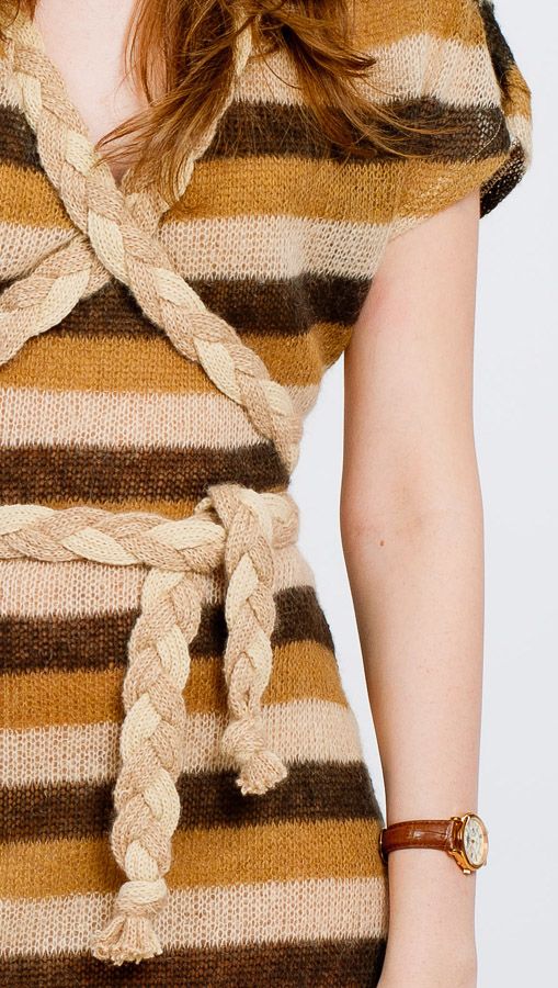 Винтажное вязаное платье с невероятно эффектным рисунком в горизонтальную полоску и ярким декором, выполненным пояском-косичкой. Эта самобытная и незаурядная модель обладает ярким колоритом и станет одной из весьма заметных моделей в гардеробе современной модницы, подчеркнув своим характером неординарность и особую харизму вкуса своей обладательницы.