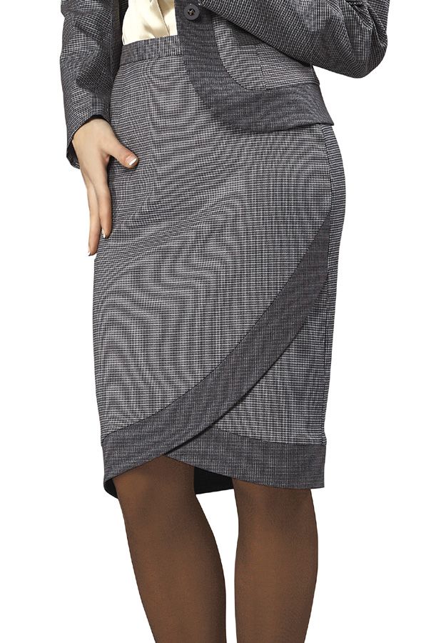 Элегантная юбка с зауженным к низу силуэтом отличается оригинальным декором широкой вставкой по низу, которая выполнена на тон темней основного фона модели. Низ юбки имеет фигурный срез, который образует изящные «волны», придающие ее фасону особый шарм и эксклюзивность. Рисунок в мельчайшую серую клетку, создающий изящный тон фона модели, гармонично сочетается со многими другими цветовыми вариантами, а классический фасон юбки подчеркнет не только респектабельность делового стиля, но также станет отличным дополнением к повседневному костюму.