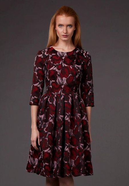 Эксклюзивная модель из новой коллекции осень-зима 2012/2013 от Хавы Арапиевой – эффектное и элегантное платье с необыкновенно богатым насыщенным рисунком из изящных красно-бордовых цветов. Как и яркий принт, особый колорит придает модели себе сама ткань - сложное плетение жаккарда, из которого выполнено платье, образует изящный рельефный узор, придавая тем самым очарование. Это яркое женственное платье, несомненно, украсит гардероб современной леди, подчеркнув элегантность вкуса своей обладательницы.