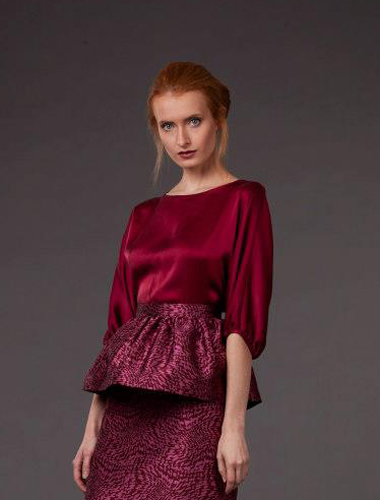 Эксклюзивная модель из новой коллекции осень-зима 2012/2013 от Хавы Арапиевой – эффектная блузка-кимоно. Элегантная модель с самобытным дизайном и дизайнерскими идеями в крое, несомненно, станет одной из самых ярких в современном модном гардеробе. Шарм ей придает элегантный рукав, удерживающегося на сгибе локтя прорезиненной манжетой, которая создает легкую драпировку, деликатный округлый вырез, подчеркивающий линию плеч. Свободный силуэт позволит подобрать к модели множество фасонов юбок и брюк, а ее колоритный бордовый тон подчеркнет многие цвета в подобранном к блузе костюме-ансамбле.