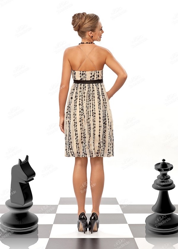Длина – чуть выше линии колен. Под грудью идёт чёрный атласный поясок, визуально завышая линию талии, придавая своей обладательнице стройности и грации. Тонкие бретели и красивое декольте делают акцент на стройной шее, плечах и груди.