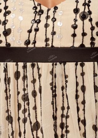 Необычное, лёгкое коктейльное платье, выполненное из лёгкой светлой ткани, украшено многочисленными металлическими пластинами и пайетками чёрного и белого цветов. Платье, словно струится по фигуре.