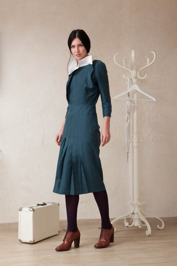 Эксклюзивная модель из коллекции Оксаны Ливенцовой для Studio Seven – элегантное платье прилегающего силуэта с фантазийными присборками, уходящими в горловину платья. Особый эффект модели также придают вертикальные складки и фигурные карманы по переднему полотнищу юбки и эффектный крой рукава в 7/8 на манжете.