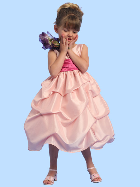 Нарядное детское праздничное платье, выполненное из переливающегося атласа. Платье отрезное по линии талии. По верхнему краю полочки заложены глубокие продольные складки. Модель посажена на две широкие бретели. Юбка по линии талии присобрана. Верхний слой юбки декорирован крупными хаотичными складками, благодаря чему создаётся объем и пышность модели. В боковом шве обработана потайная застежка молния. По линии талии изделие дополнено широким атласным поясом контрастного цвета. Пояс декорирован большим цветком.