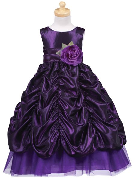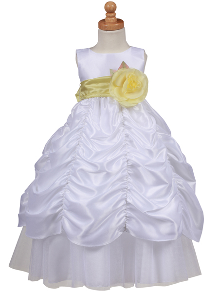 Нарядное детское праздничное платье, выполненное из переливающегося атласа и полупрозрачного лёгкого шифона. Платье отрезное по линии талии. По верхнему краю полочки заложены глубокие вертикальные драпировки. Модель посажена на две широкие бретели. Юбка по линии талии присобрана. Верхний слой юбки декорирован многочисленными мелкими горизонтальными и вертикальными драпировками, благодаря чему создаётся объем и пышность модели. Нижний слой виднеется на несколько сантиметров. Потайная застежка молния вшита сзади посередине. По линии талии изделие дополнено широким атласным поясом контрастного цвета. Пояс декорирован большим цветком.