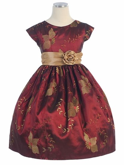 Нарядное детское праздничное платье, выполненное из переливающегося атласа. Платье отрезное по линии талии. По верхнему краю полочки заложены глубокие продольные складки. Модель имеет короткие рукава, прикрывающие плечики. Юбка по линии талии присобрана. Верхний слой юбки декорирован крупными хаотичными складками, благодаря чему создаётся объем и пышность модели. Потайная застежка молния вшита сзади посередине. По линии талии изделие дополнено широким атласным поясом контрастного цвета. Пояс декорирован большим цветком.