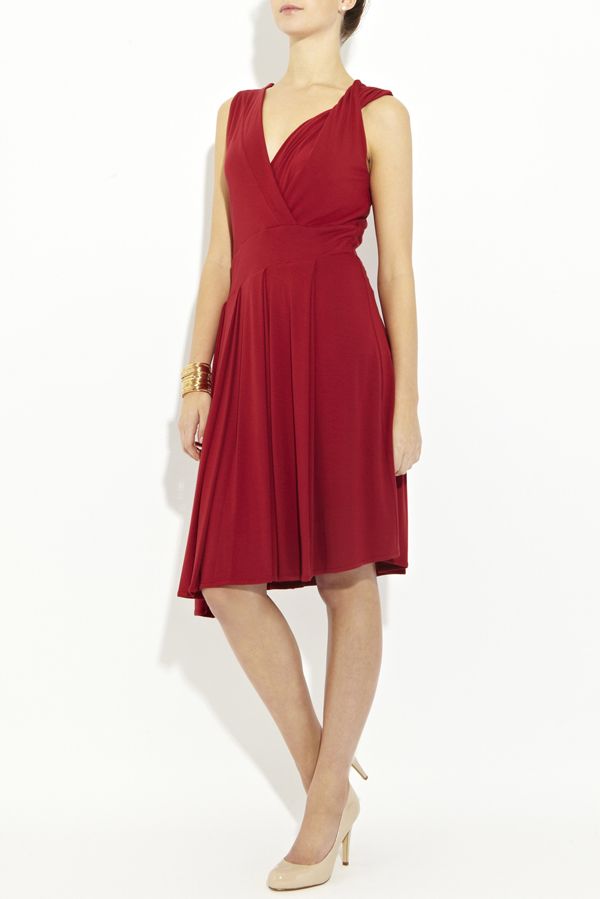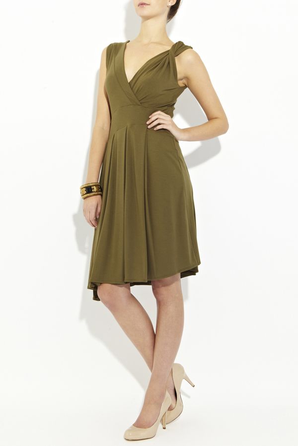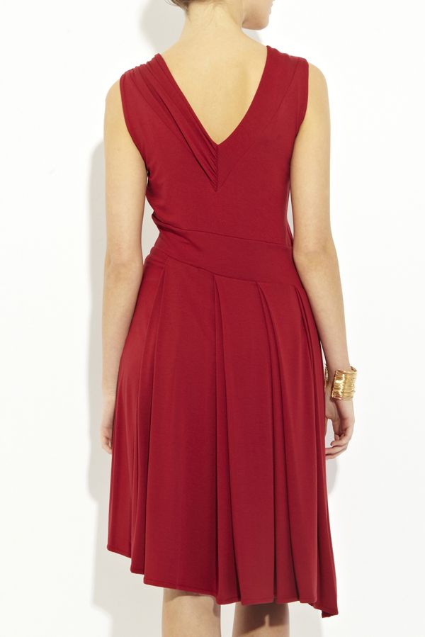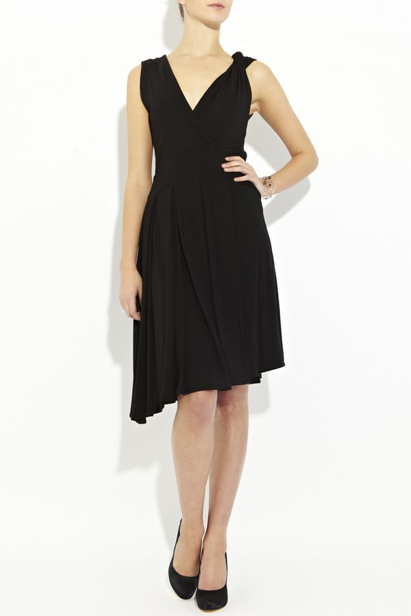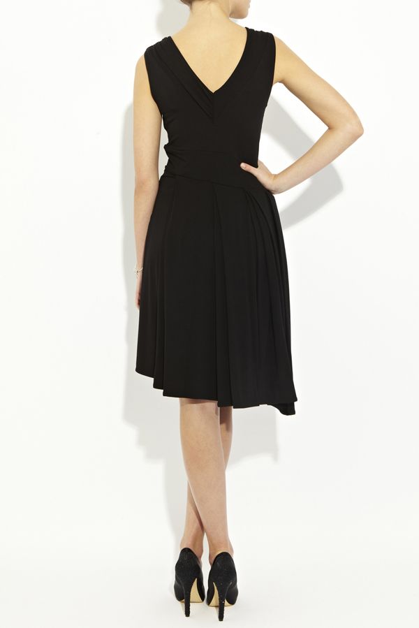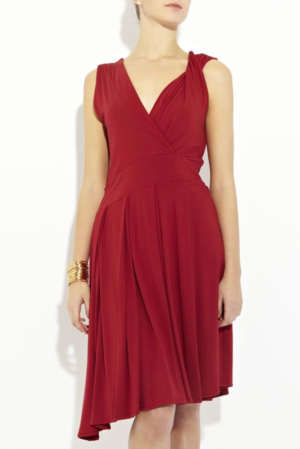 Эффектное платье отрезное по талии с изящной юбкой, драпированной по всему объему и элегантным кроем верха, шарм которому также придает деликатные драпированные складки. Глубокий v-образный вырез эффектно переходит в декорированный вырез на спине, а асимметричный срез низа подчеркивает неординарность всего стиля модели.