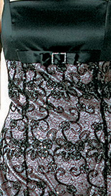 Платье облегающего силуэта в элегантном и очаровательном стиле «ампир» с изящной отрезной кокеткой, выполненной из атласа. Шарм и особый эффект модели придает основная ткань – ажурное кружево черного цвета, которое потрясающе выглядит на светлом фоне основы. Платье декорировано кокетливым бантиком, на плечах удерживается деликатными атласными лямками-лентами.