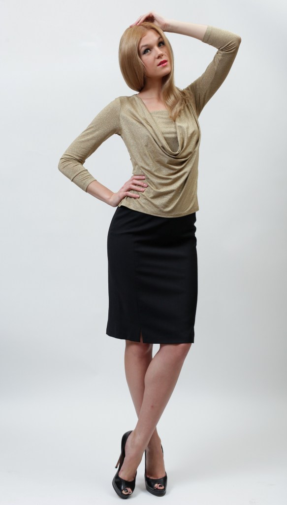 Отличительная особенность данной модели – изысканный цельнокроеный воротник-хомут, декорированный драпировками. Под воротником имеется тонкая подкладка, которая придаёт этой блузе пикантность и изысканность. Длина изделия – до середины линии бедра. Рукава длинные, прямые, прилегающие к рукам.