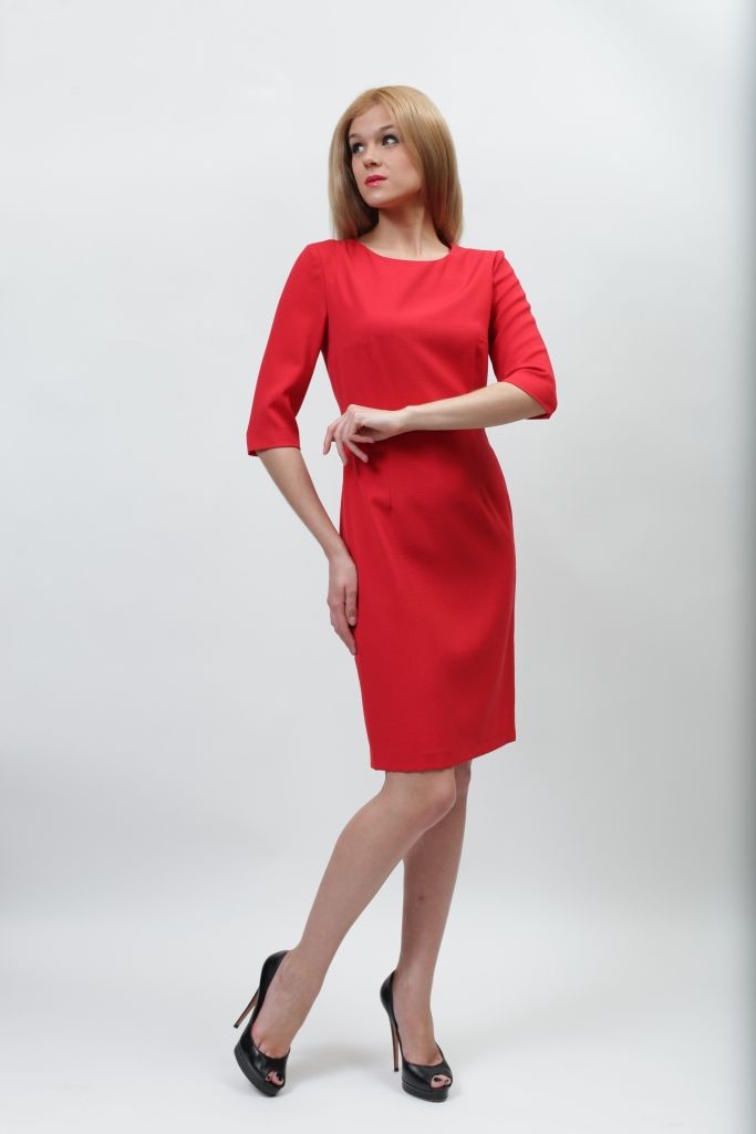 Рукава – три четверти, длина платья – до линии колен. Вырез горловины имеет округлые формы, в меру открывая красивую шею.