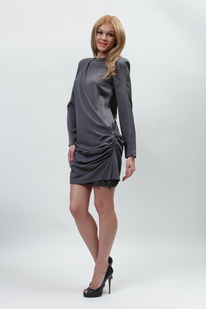 Платье отличается своим необычным фасоном и покроем. Длина изделия – выше линии колен. Вырез горловины – небольшая лодочка. Рукава прямые, длинные, немного свободные. С правого плеча красиво спускается широкий лоскут ткани, плавно переходящий на линию талии.