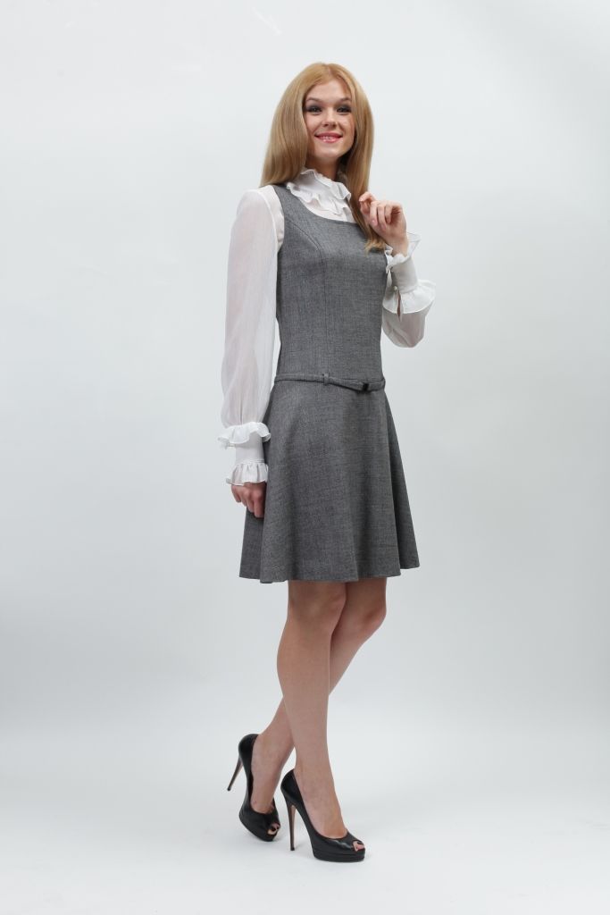 Этот сарафан станет одной из самых необходимых вещей в вашем гардеробе, когда наступят холодные дни. Сарафан имеет две широкие бретели и глубокий вырез горловины. Это позволяет надеть под него красивую блузу с рюшами. Длина изделия – чуть выше линии колен.