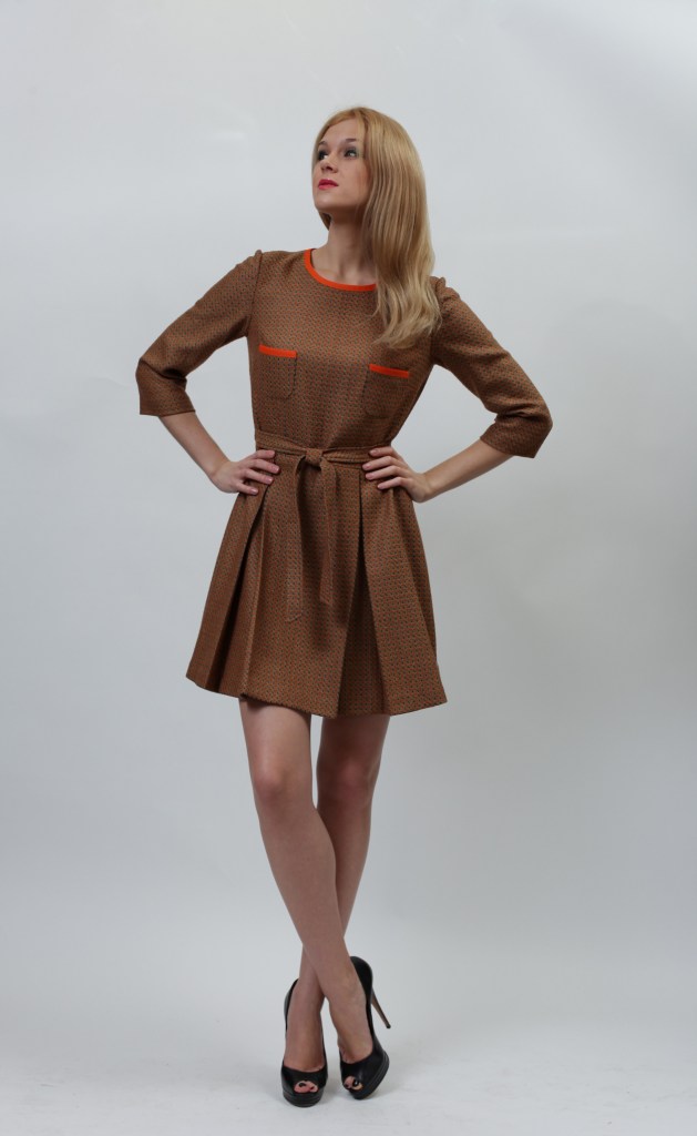 Платье выполнено из ткани тёмно-горчичного цвета. В качестве элементов декора используются небольшие вставки из ярко-оранжевой ткани, которые окаймляют небольшой вырез горловины и два маленьких накладных кармана, расположенных на груди.