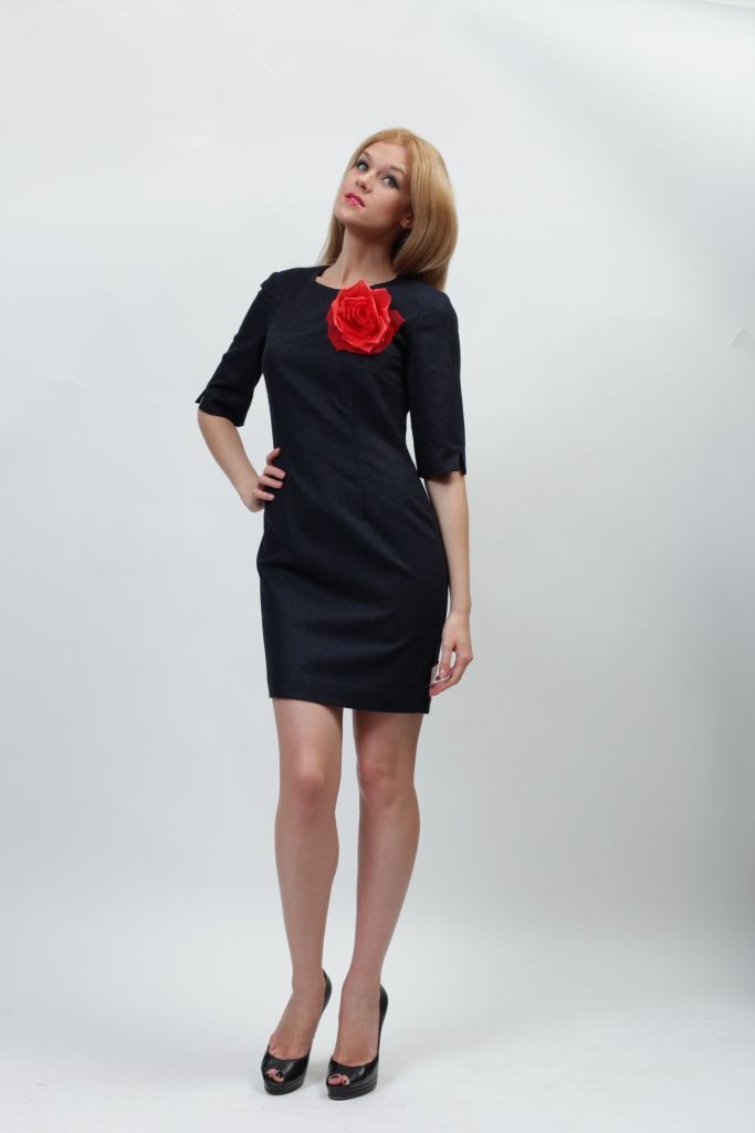 По линии талии проходит две вертикальные вытачки, позволяющие платью красиво облегать фигуру. Сверху, возле выреза горловины, имеется большой красный цветок, разбавляющий своей яркость строгость тёмного цвета.