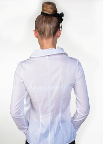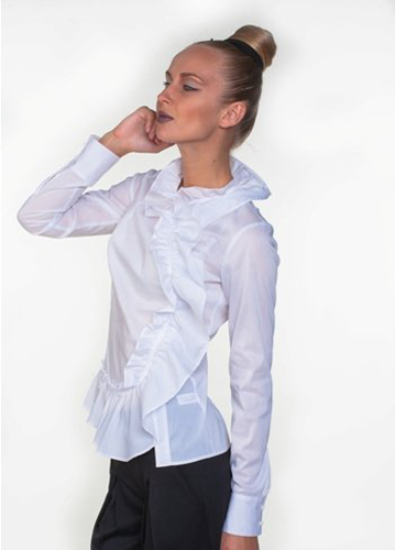Белоснежная блузка с роскошной отделкой широким воланом, который образует «баску» спереди, переходит в изумительный волан, за которым скрывается застежка, а еще – создает удивительно очаровательную окантовку выреза горловины. Нарядна, праздничная блуза, которая будет достойна самого эффектного Вашего выхода.