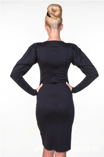 Оригинальное черное платье с изысканной драпировкой спереди, образующей каскад волн, струящихся от центра к талии. Особый колорит и шарм модели придают рукава-буфы – один из хитов модного кроя нынешнего сезона, а также фигурный срез низа. V-образный вырез горловины позволит бесконечно фантазировать над подбором аксессуаров и украшений к модели, которые подчеркнут индивидуальность Вашего стиля.