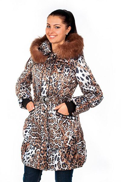 Куртка с оригинальным принтом, сочетающим рисунок «леопард» и «цепи», которые создают удивительно гармоничный цветовой ансамбль. Стеганная удлиненная модель имеет эластичный пояс, выполненный в тон основному принту. Капюшон куртки, который возможно отстегнуть, оторочен натуральным мехом песца (опушка также отстегивается). Застежка этой модели – кнопки и молния, которая также использована на прорезных карманах. Еще одна небольшая «изюминка» куртки – элегантный декор присборенными деталями низа.