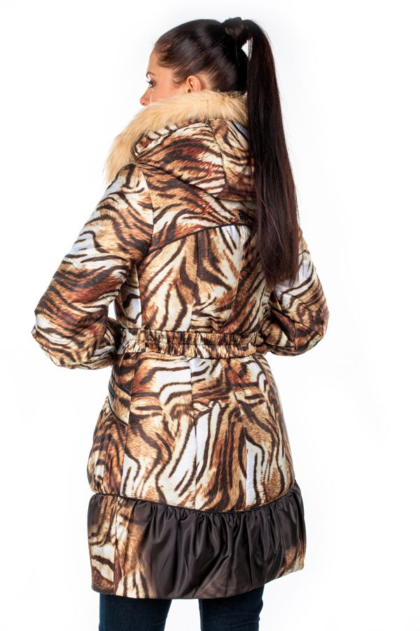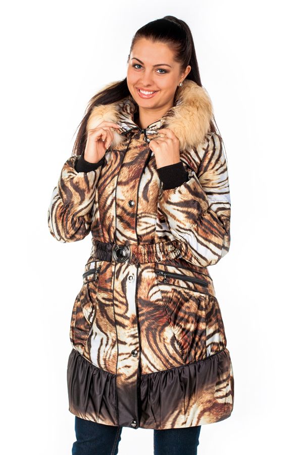Удлиненная стеганая куртка с необычным ярким принтом «тигр». Модель выполнена в приталенном силуэте, который особенно подчеркивает эластичный пояс. Несомненная «изюминка» куртки – отстегивающийся капюшон, отороченный натуральным мехом песца (опушка также отстегивается). Застежка модели - кнопки и молния, которая также использована на прорезных карманах. Низ куртки элегантно декорирован присборенными деталями.