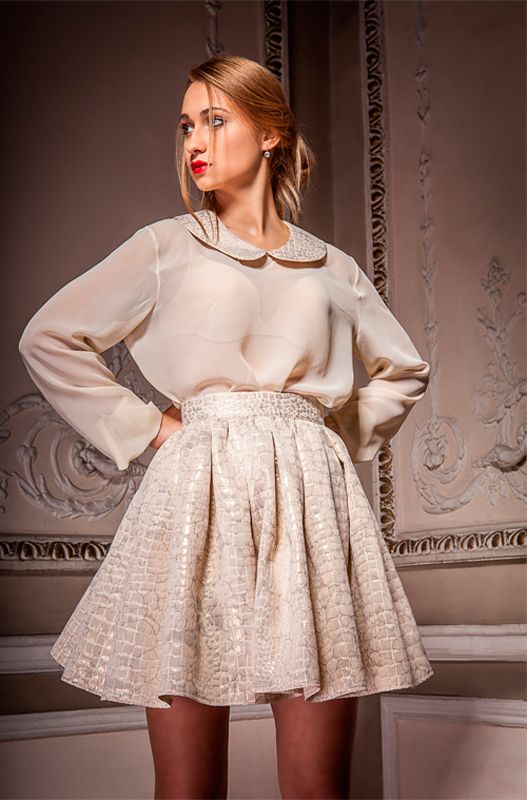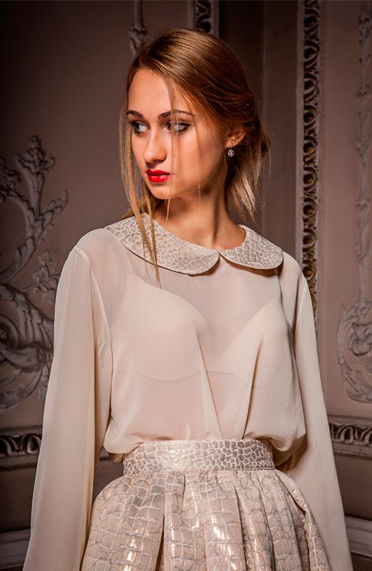 Изящная "воздушная" блузка с восхитительным декором из изысканной парчи, которой выполнен воротник и манжеты рукавов - одна из самых элегантных моделей коллекции бренда Betrendy. Праздничная и утонченная модель эффектно сочетается с парчовой юбкой (модель под кодом BERT-ub), которая составляет с блузкой невероятно эффектный и колоритный ансамбль. Озорной и в тоже время женственный комплект, придаст особый колорит Вашему выходу и всегда подчеркнет особую изысканность и утонченность Вашего стиля.