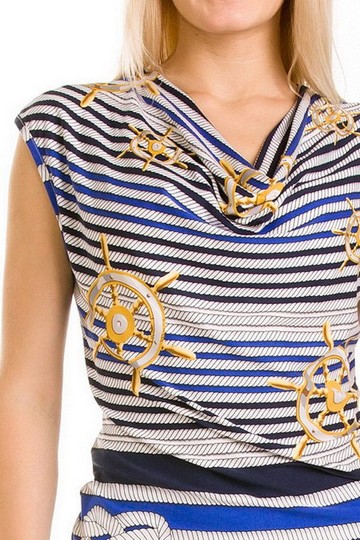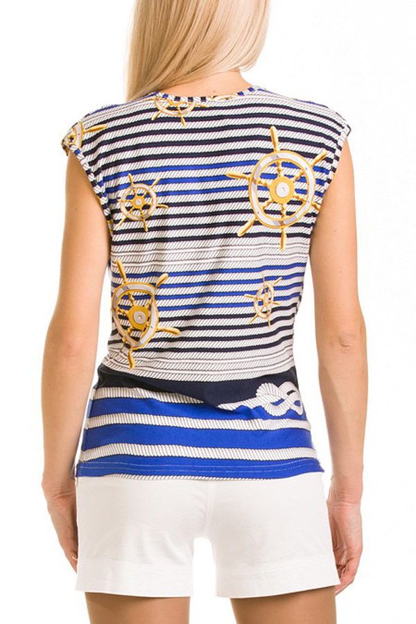 Морская тема, голубой цвет, оригинальная и эффектная полоска... в этой легкой летней блузке собраны все модные веяния сезона. Приталенный силуэт в сочетании с каскадом волн у выреза горловины создают удивительное сочетание в стиле, придают блузке особую "изюминку".