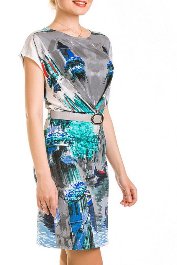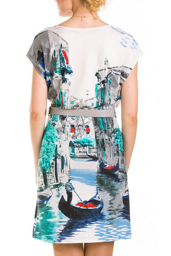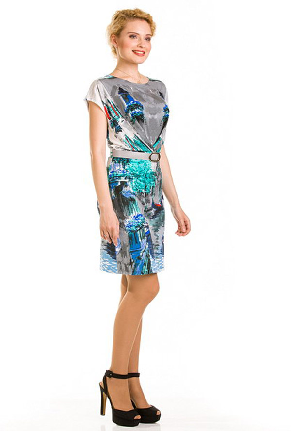 Колоритное и яркое, а вместе с тем - элегантное платье свободного силуэта. Морские мотивы и лазурно-голубой тон придают модели особую изфсканность и романтичность, создают колорит и яркость образа. Поясок на талии подчеркивает грацию силуэта, подчеркивает изящество фигуры. Яркая модель станет одной из самых эффектных в Вашем модном гардеробе.