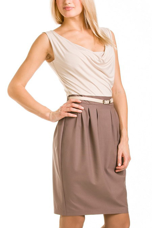 Необычайно элегантное, стильное платье нежных молочного и кофейного тонов, вместе создающих изысканную цветовую гармонию. Изысканному крою юбки "тюльпан" особый колорит придают защипы у кокетки, образующие легкую драпировку. Ниспадающий мягкими струящимися волнами крой верха придает платью шарм элегантности и утонченную женственность в характере. Изысканная, но вместе с тем "простая" модель, придаст особый колорит модному гардеробу.