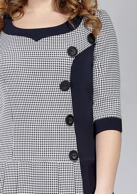 Изящное платье с кокеткой, которая придает модели легкую игривость и юбкой-колокол, которая создает изящный образ. Контрастная вставка сбоку придает всему силуэту особую стройность и грацию, а декор широкими кантами манжет рукавов, выреза горловины и оригинальные пуговицы - эксклюзивность и индивидуальность стиля. Стильная и эффектная модель для модного гардероба современной леди.