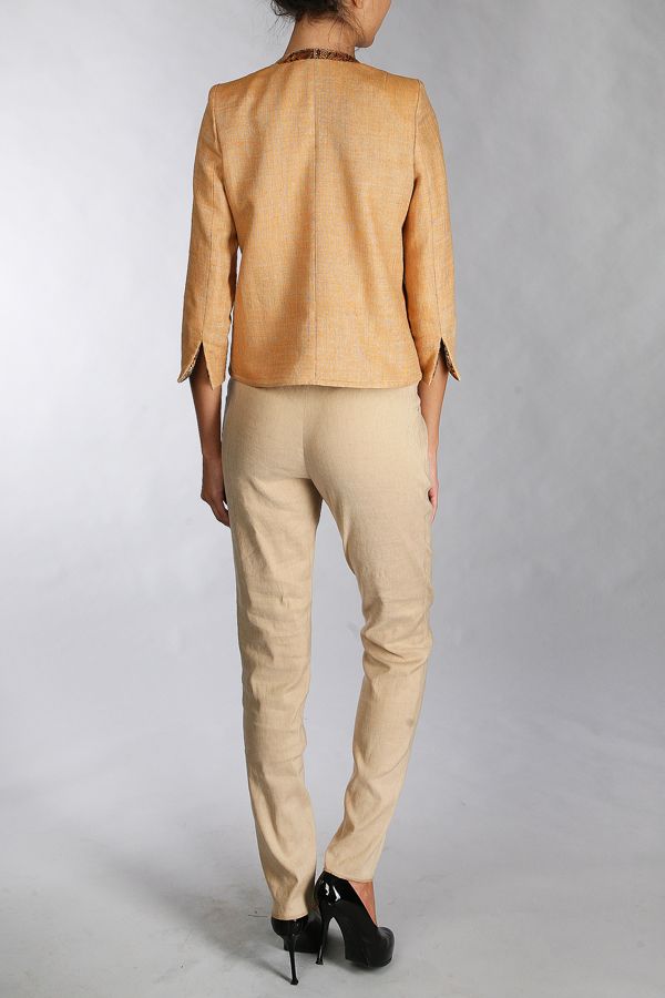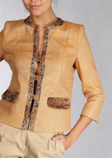 Модель из эксклюзивной коллекции Елены Шипиловой - невероятно выразительный и эффектный жакет с неординарными дизайнерскими идеями. Декор полочек и карманов, а также окантновка выреза горловины и рукавов "змеиной кожей", незаурядное решение для застежки на пуговицы, рукава в 3/4 с пикантными разрезами манжет, проникновенный песочный цвет модели... этот жакет способен придать особый колорит любому костюму, буть-то деловой ансамбль, или повседневный гардероб.