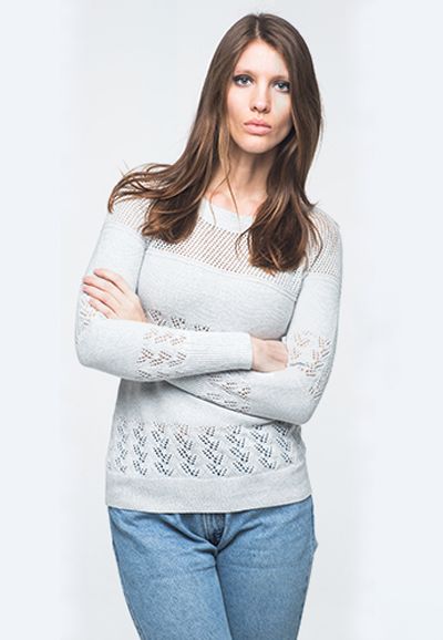 Эффектная, "легкая" ажурная кофта из новой коллекции Tocini. Модель отичается сочетанием двух видов ажурных узоров - "колосками", которые выполнены на рукавах и по низу модели, а также фантазийной "сеточкой", которая образует пикантную кокетку, давая акцент на выразительный глубокий вырез горловины. Облегающего фасона кофта представлена в очаровательных пастельных цветах, особый шарм модели придает использование сверкающего люрекса.