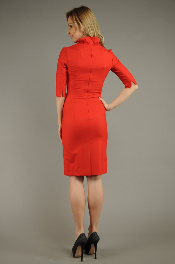 Эксклюзивная модель бренда Stella di mare - яркое платье с эффектными идеями в крое. Обтягивающий силуэт, подчеркивающий стройность фигуры, оригинальные рукава длиной до локтя с миниатюрными разрезами, но главное - удивительно стильное решение воротника, присборенного пикантным рюшем, который особенно подчеркивает изящество выреза горловины в форме "сердечка". Эффектный красный цвет подчеркнет яркость стиля обладательницы этой модели, платье, несомненно, станет одним из самых колоритных в Вашем новом гардеробе. Застежка платья - на спинке на "молнию", сзади - удобная шлица.
