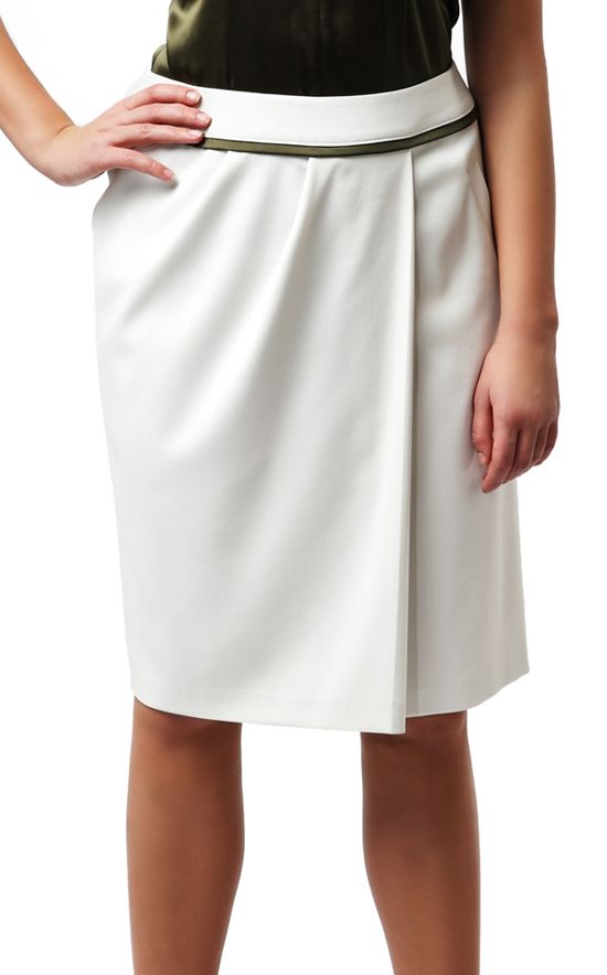 Эксклюзивная модель из новой коллекции Yulia Dushina - оригинальная юбка с имитацией запашного кроя, который образует пикантную складку спереди. Эффект модели придает контрастный тонкий кант, подчеркивающий линию бедер. Юбка имеет потайную застежку молнию сзади, справа - боковой карман «в листочку».