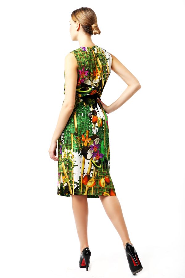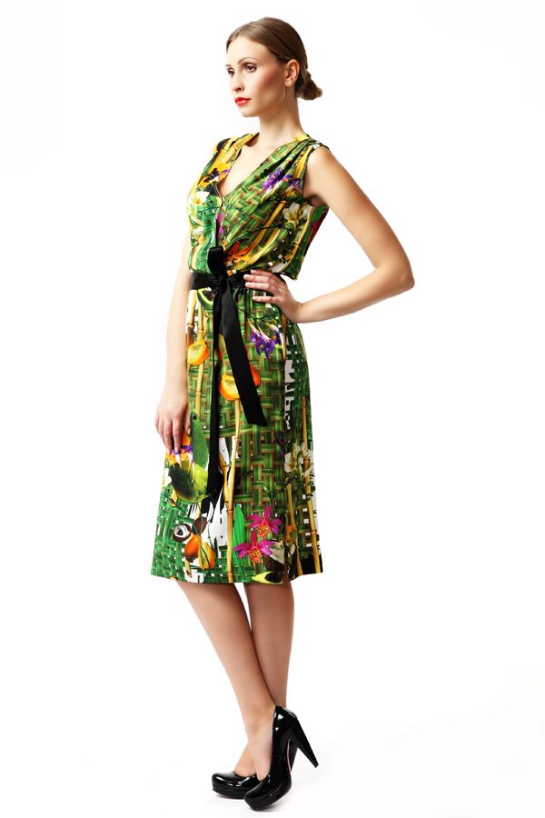 Эксклюзивная модель из новой коллекции Yulia Dushina - платье из шелка с эластичной талией, которая дополнительно подчеркивается контрастным черным поясом. Оригинальность лифу придает необычный крой, имитирующий запашной. Платье - прямое до середины икры с небольшими разрезами по бокам выполнено из тканей с принтами "многоцветный фейерверк" и "зеленый бамбук".
